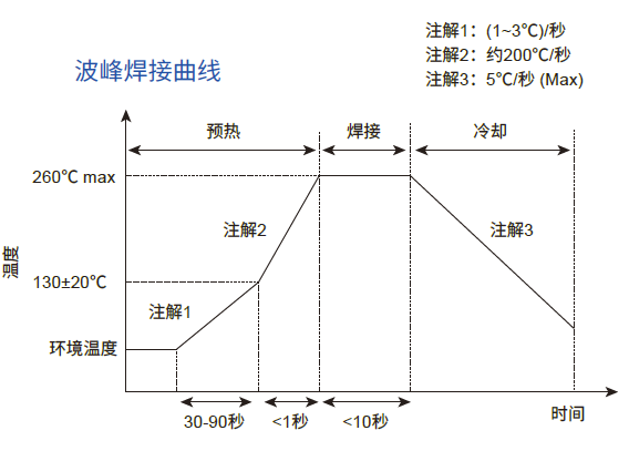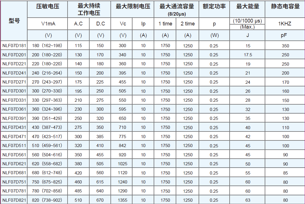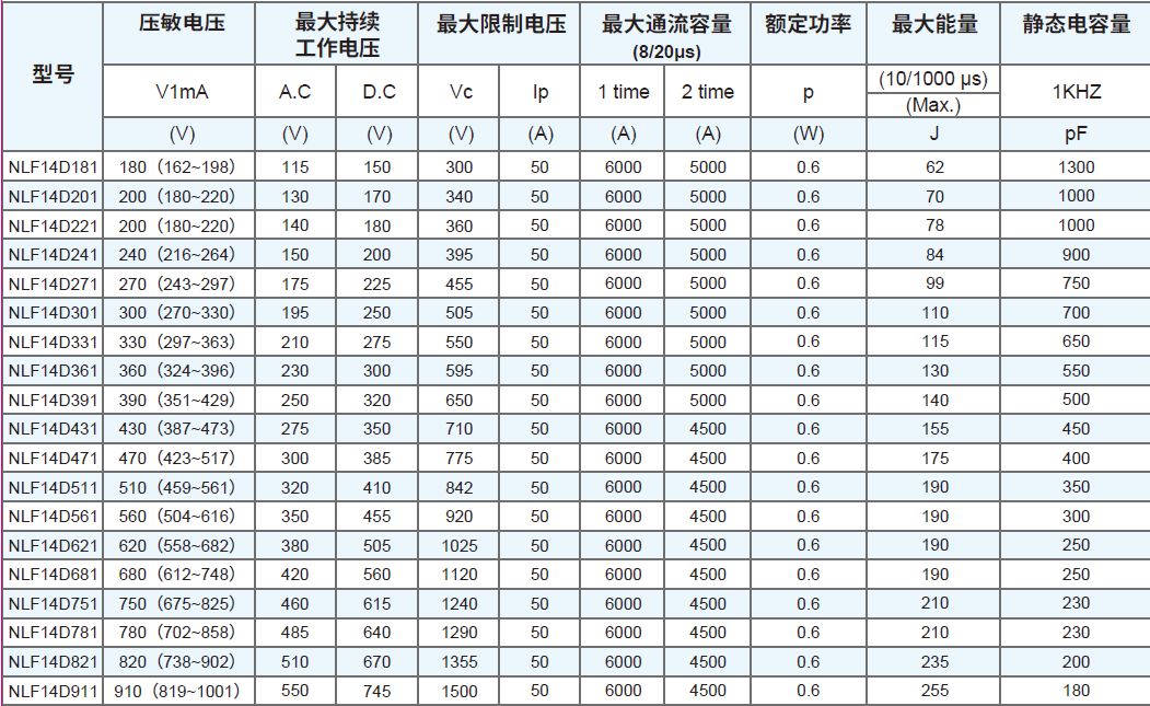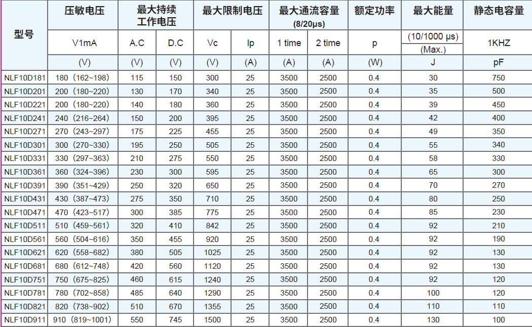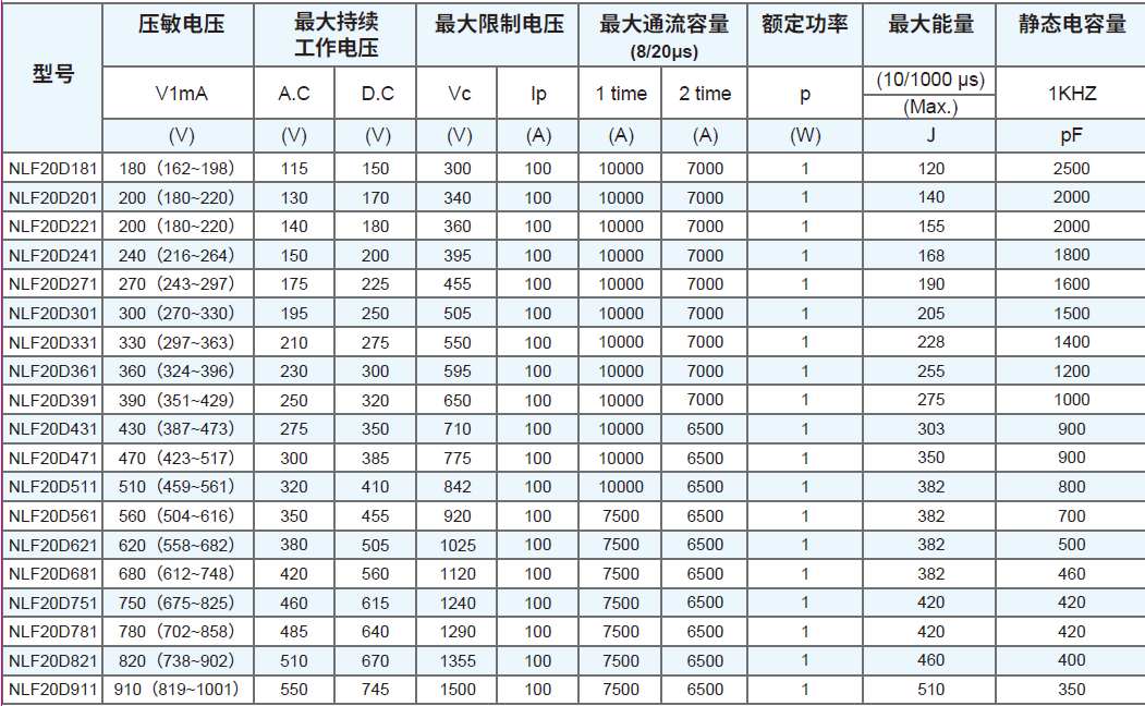 符合 RoHS、HF、REACH 要求 本體尺寸:Ф7mm ~ Ф20mm 寬工作電壓范圍:180 Vac ~ 1000 Vac 寬工作溫度范圍:-40℃ ~ +85℃ 儲存溫度范圍:-40℃ ~ +125℃ 安規(guī)認(rèn)證:CQC 抑制浪涌電流的能力強(qiáng) 低漏電流 優(yōu)越的限制電壓特性 徑向引線環(huán)氧樹脂封裝 命名規(guī)則 結(jié)構(gòu)與尺寸 07D系列壓敏電阻對照表 10D系列壓敏電阻對照表 14D系列壓敏電阻對照表 20D系列壓敏電阻對照表 額定值減額曲線 沖擊電流波形 (8/20μS) 推薦焊接條件 倉庫存儲條件 存儲條件:1. 儲存溫度:-10℃~+40℃ 2. 相對濕度:≦75%RH 3. 不要將本產(chǎn)品存放在有腐蝕性氣體或是陽光直接照射的環(huán)境中保管。 存儲期限:1 年