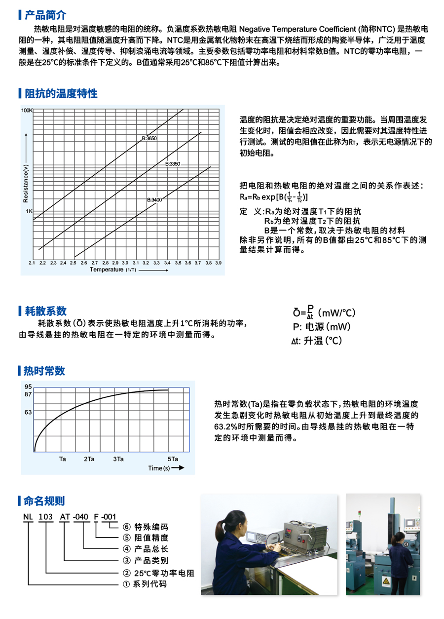 熱敏電阻是對(duì)溫度敏感的電阻的統(tǒng)稱(chēng)。負(fù)溫度系數(shù)熱敏電阻 Negative Temperature Coefficient (簡(jiǎn)稱(chēng)NTC) 是熱敏電阻的一種,其電阻阻值隨溫度升高而下降。NTC是用金屬氧化物粉末在高溫下燒結(jié)而形成的陶瓷半導(dǎo)體,廣泛用于溫度測(cè)量、溫度補(bǔ)償、溫度傳導(dǎo)、抑制浪涌電流等領(lǐng)域。主要參數(shù)包括零功率電阻和材料常數(shù)B值。NTC的零功率電阻,一般是在25℃的標(biāo)準(zhǔn)條件下定義的。B值通常采用25℃和85℃下阻值計(jì)算出來(lái)。