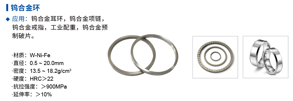 高比重合金是一種以鎢為基體,并添加入少量Ni、Fe、Mn、Co、Cu、Mo、Cr 等元素組成的合金,具有密度高、強(qiáng)度高、硬度高、延展性好、導(dǎo)電性及導(dǎo)熱性好等優(yōu)異性能;其密度可以達(dá)到15.5~18.70g/cm3。鎢合金常規(guī)形狀的成品有鎢合金粒、鎢合金球、鎢合金環(huán)等。