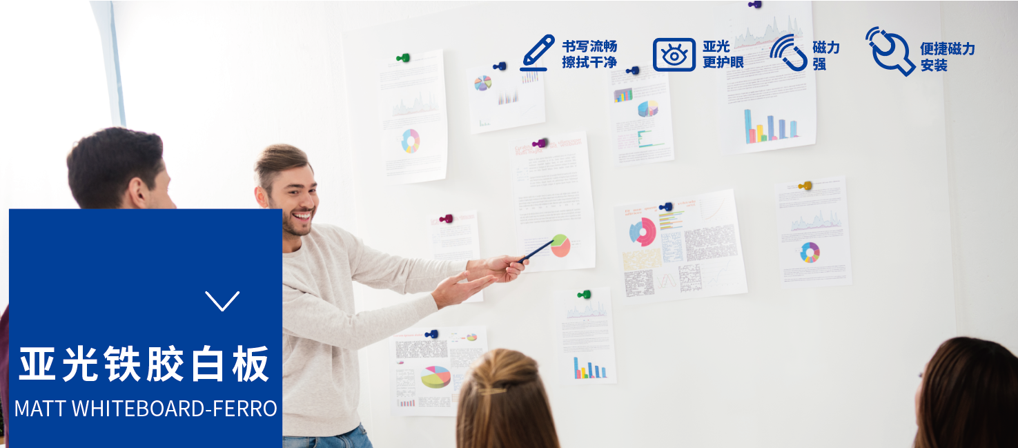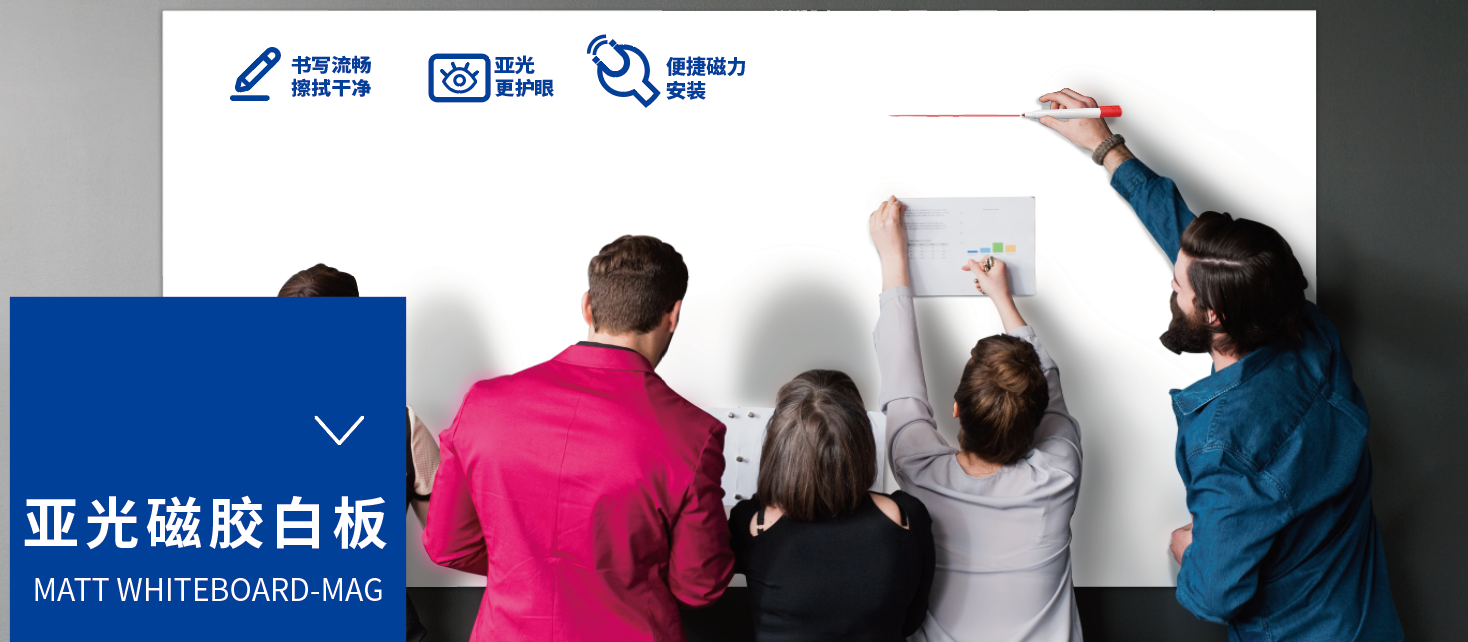 亞光鐵膠白板是由專業(yè)白板膜PET材質(zhì)與鐵膠構(gòu)成,亞光擦寫膜表面有細(xì)膩的紋理,柔和的光澤,各種白板筆都能舒適地書寫和擦拭。
