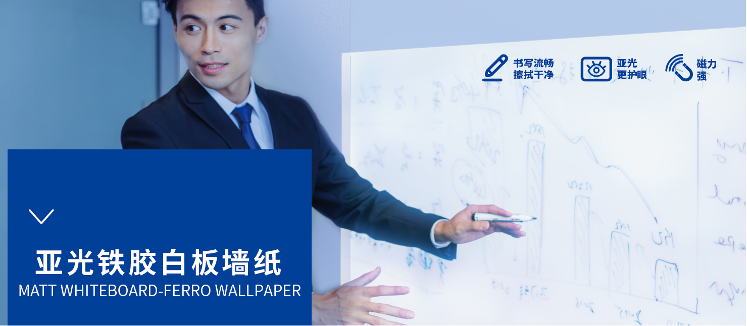 亞光或投影鐵膠白板墻紙的表面是光澤度柔和的PET白板膜,不反光的效果在大面積安裝后的質(zhì)感非常舒服。
